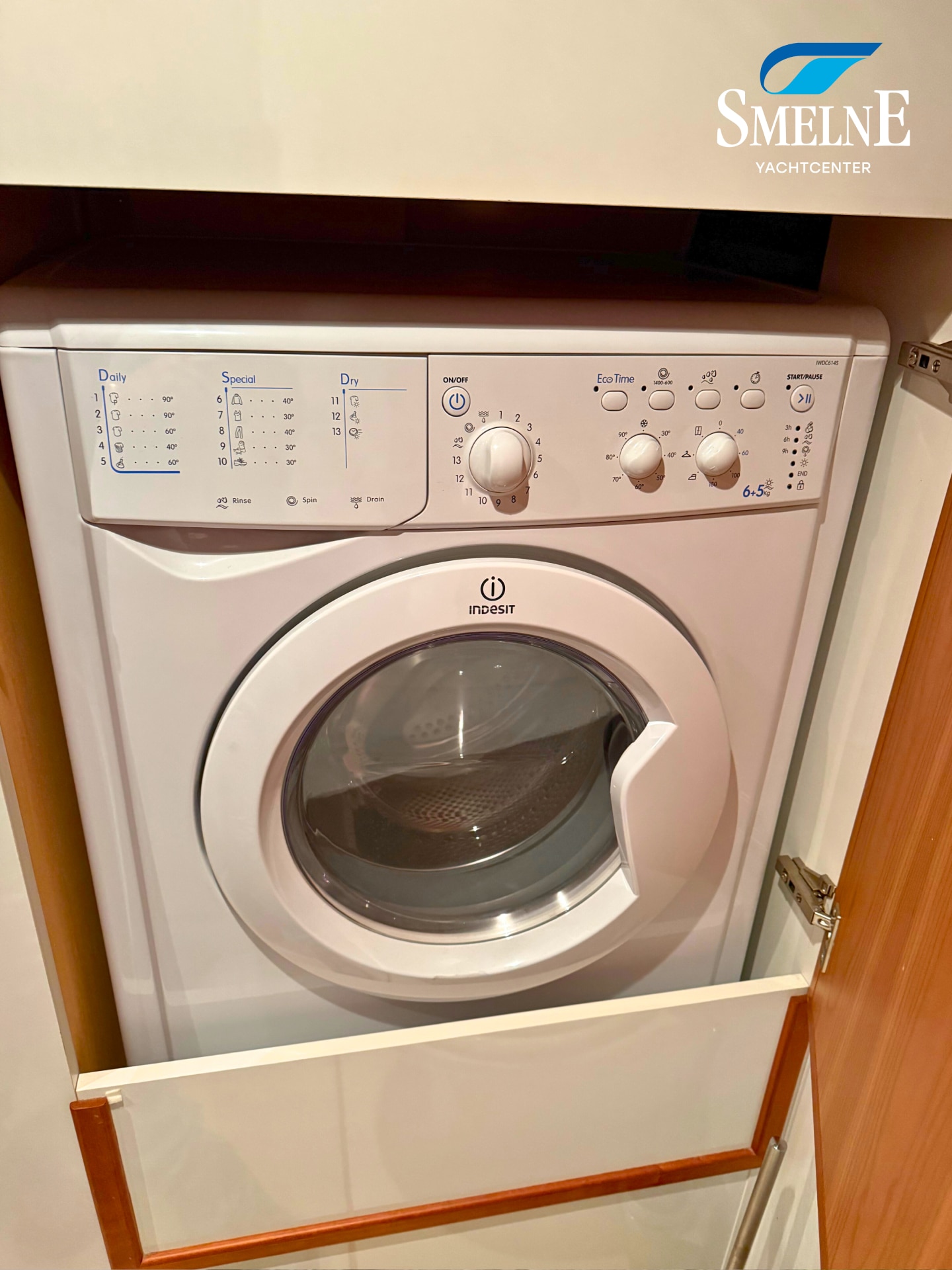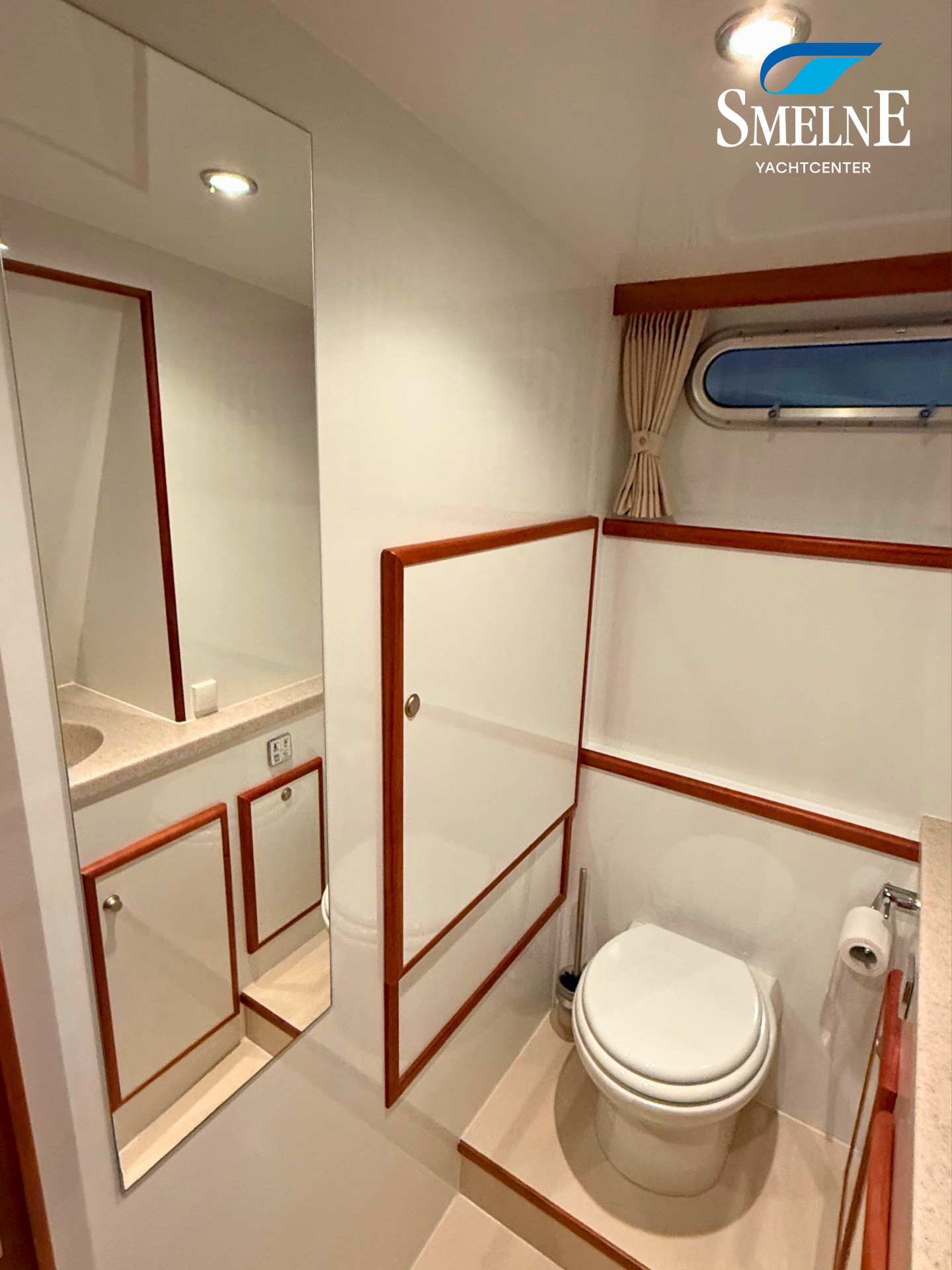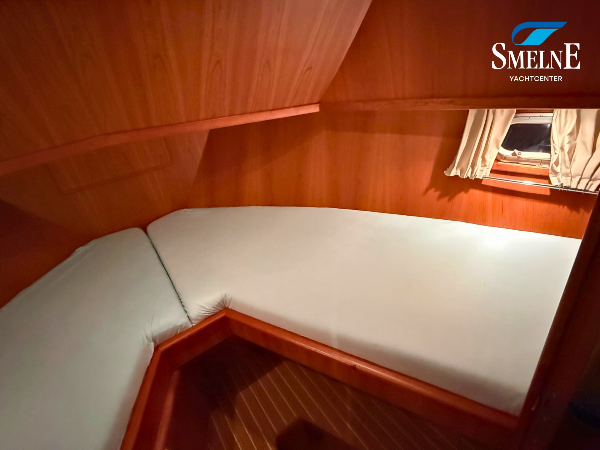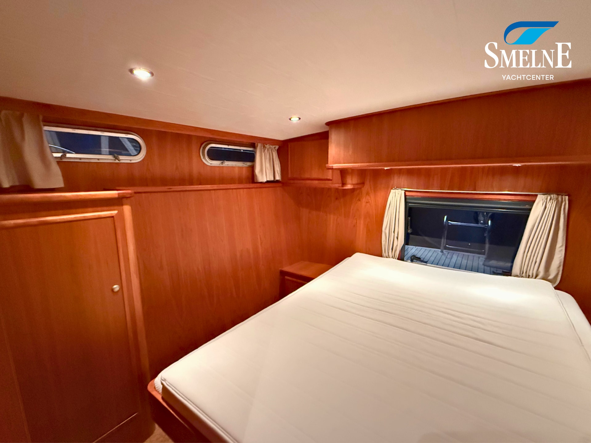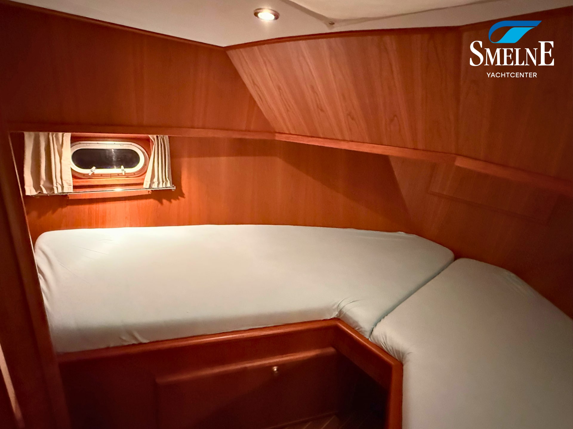 In het voorschip bevindt zich een gastenhut met comfortabel V-bed, geschikt voor uw gasten of (klein-)kinderen. Vanuit de salon zijn centraal toegankelijk twee separate sanitaire ruimtes: één met douche en één met toilet en wasgelegenheid, gecombineerd met een was-/droogcombinatie. De eigenaarshut in het achterschip is een rustige, afgesloten ruimte met een vrijstaand ruim tweepersoonsbed, spiegelluik en voldoende kastruimte. Een plek om u echt even terug te trekken en volledig tot rust te komen na een dag op het water.