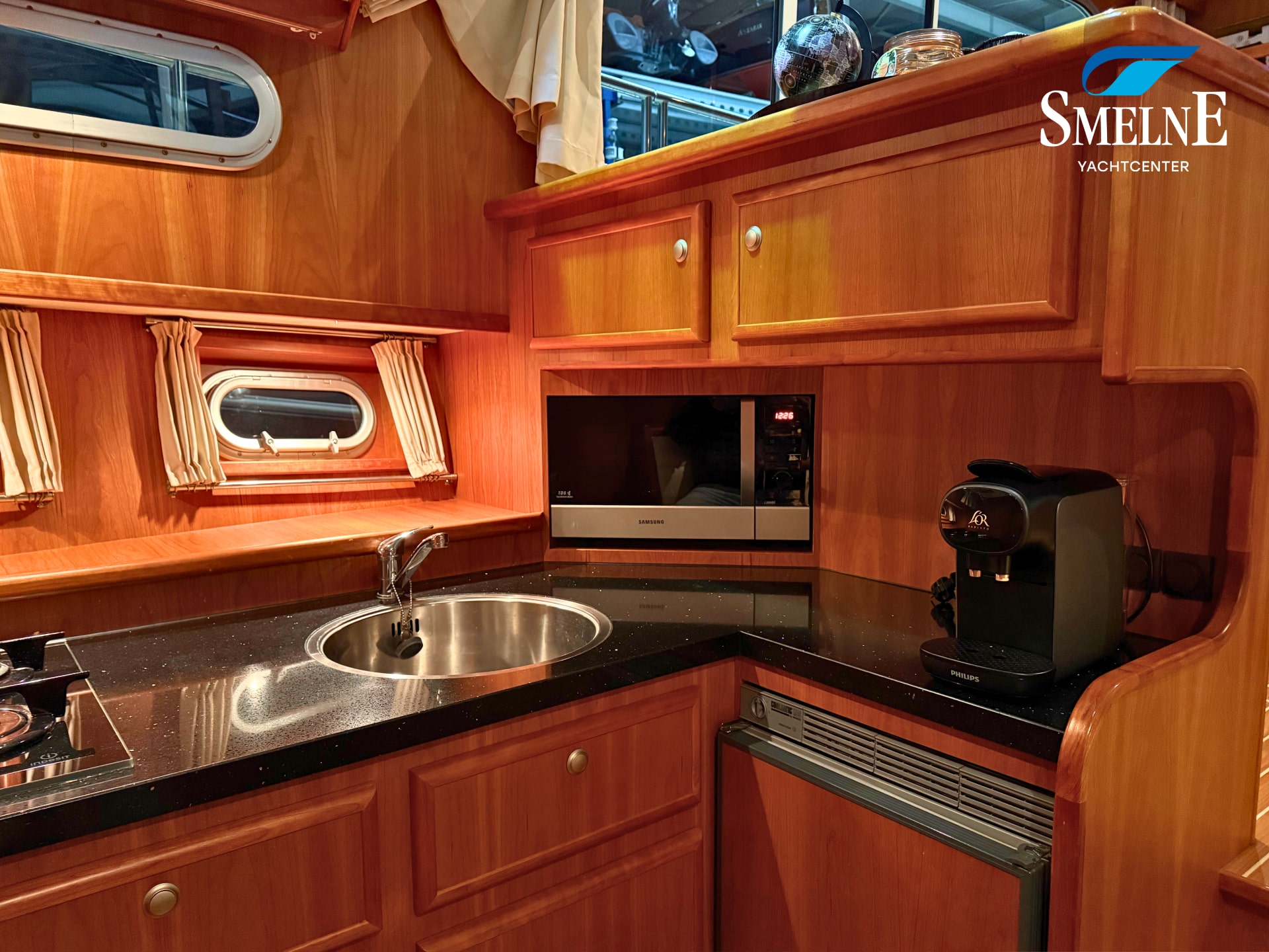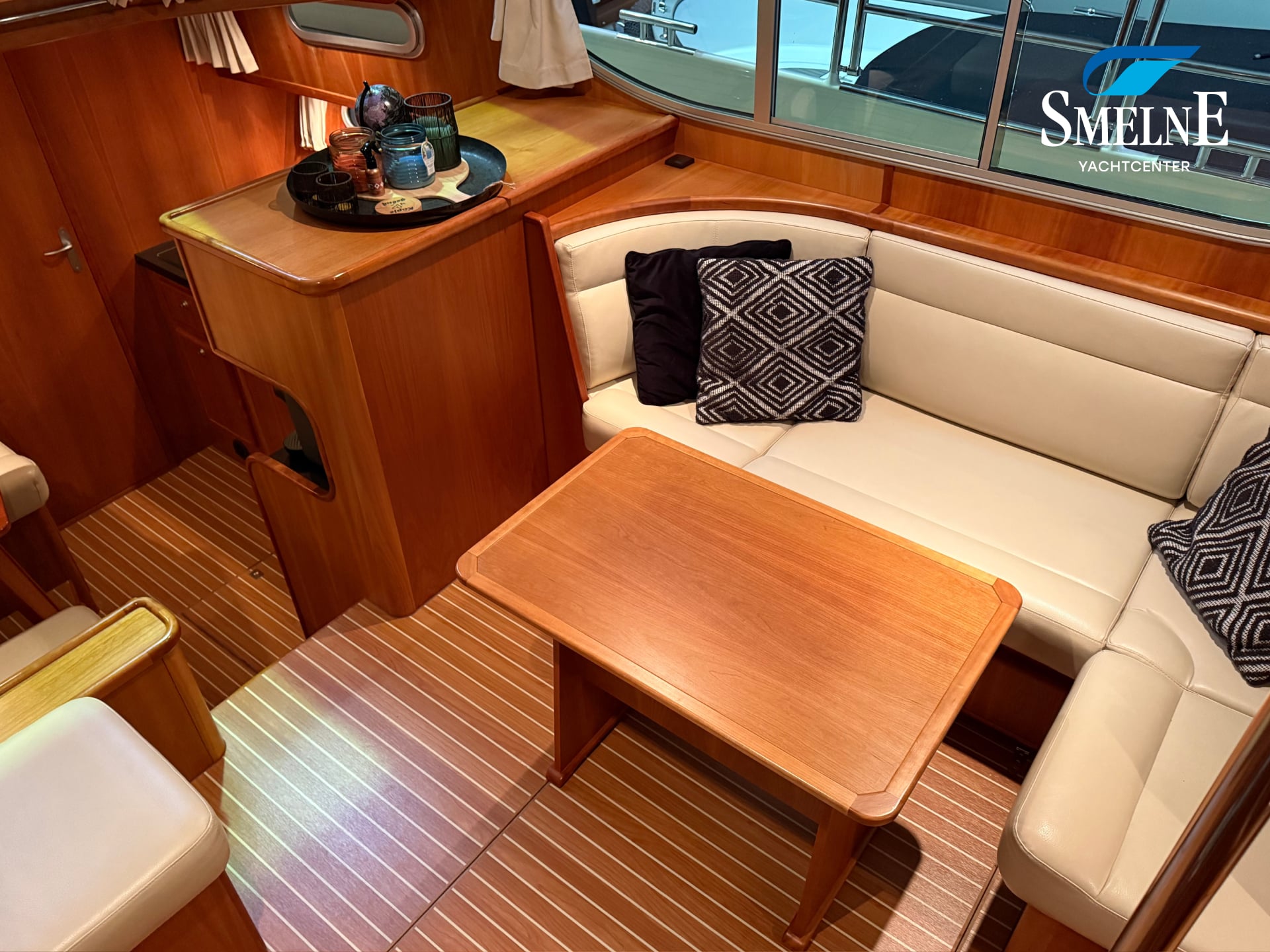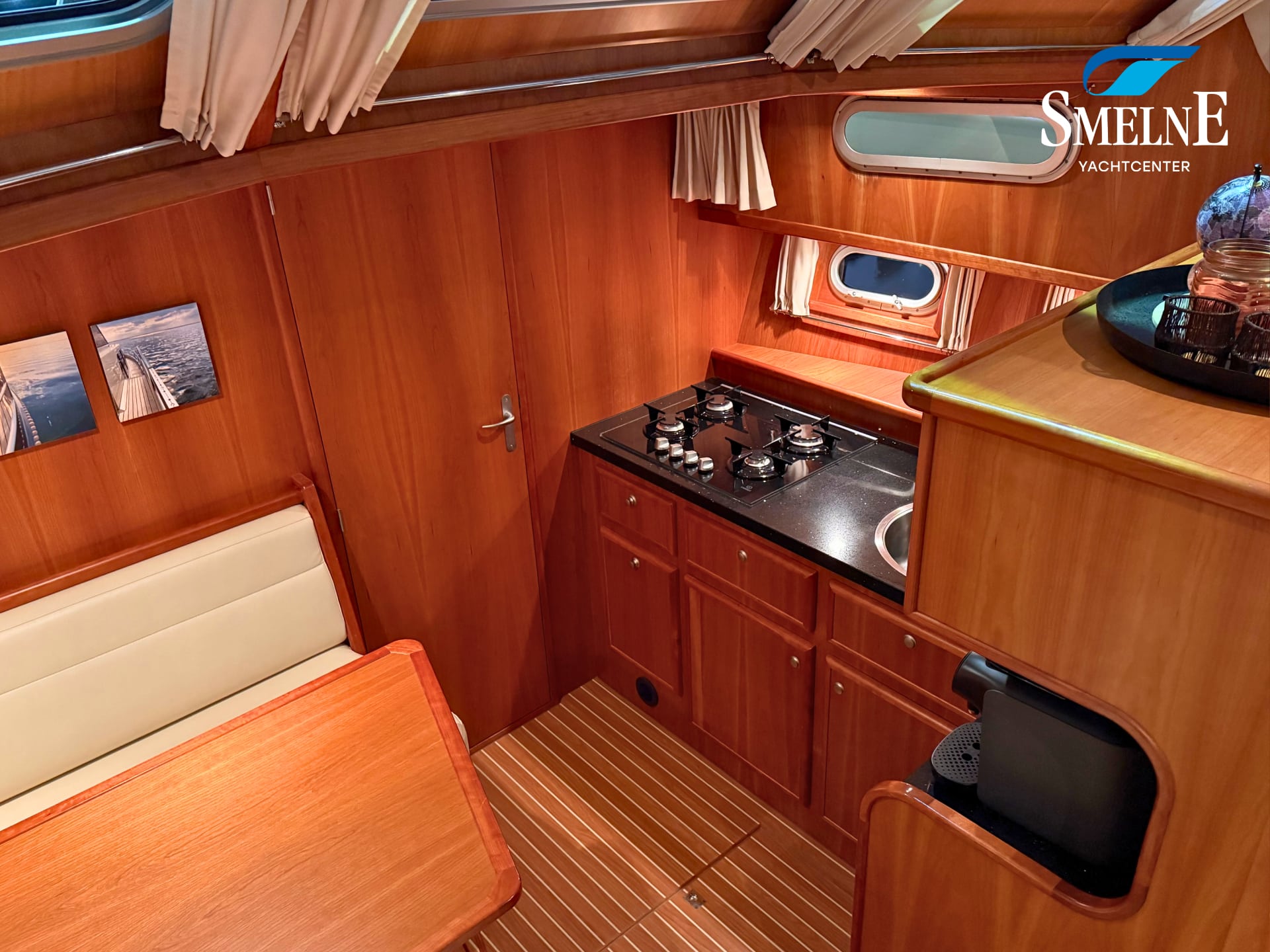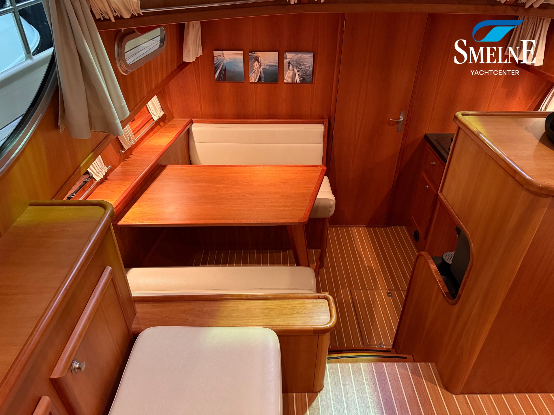 Vanaf het achterdek is de salon direct toegankelijk, waar de L-vormige bank uitnodigt om even te ontspannen en samen te genieten. Het interieur is uitgevoerd in klassiek kersenhout, met teakline vloeren en hoogwaardige lederen bekleding, wat bijdraagt aan de warme en verzorgde uitstraling aan boord. Aansluitend ligt de kombuis met dinette, een plek waar u onderweg rustig kunt ontbijten of ’s avonds uitgebreid dineert, helemaal in alle rust en privacy.