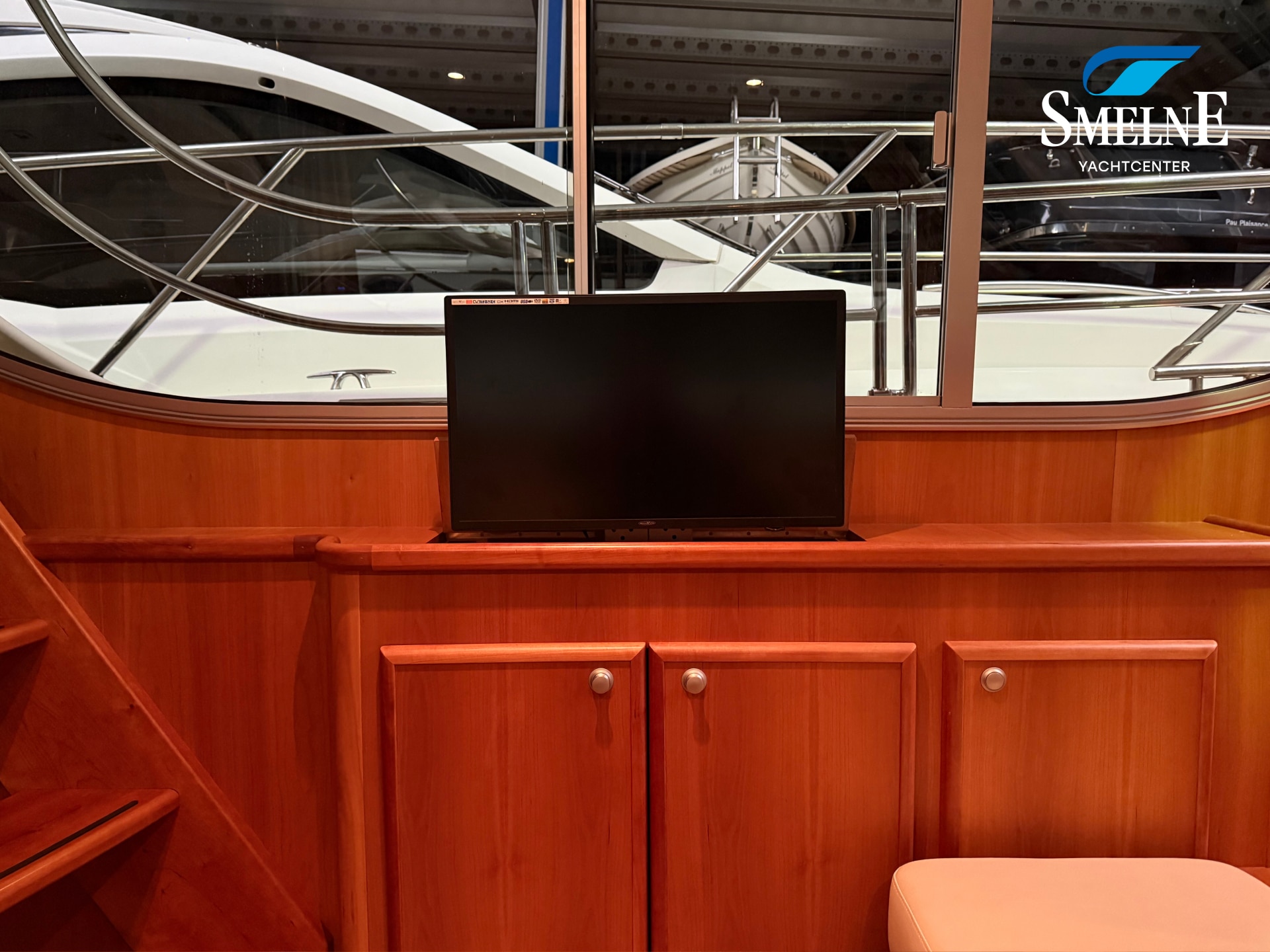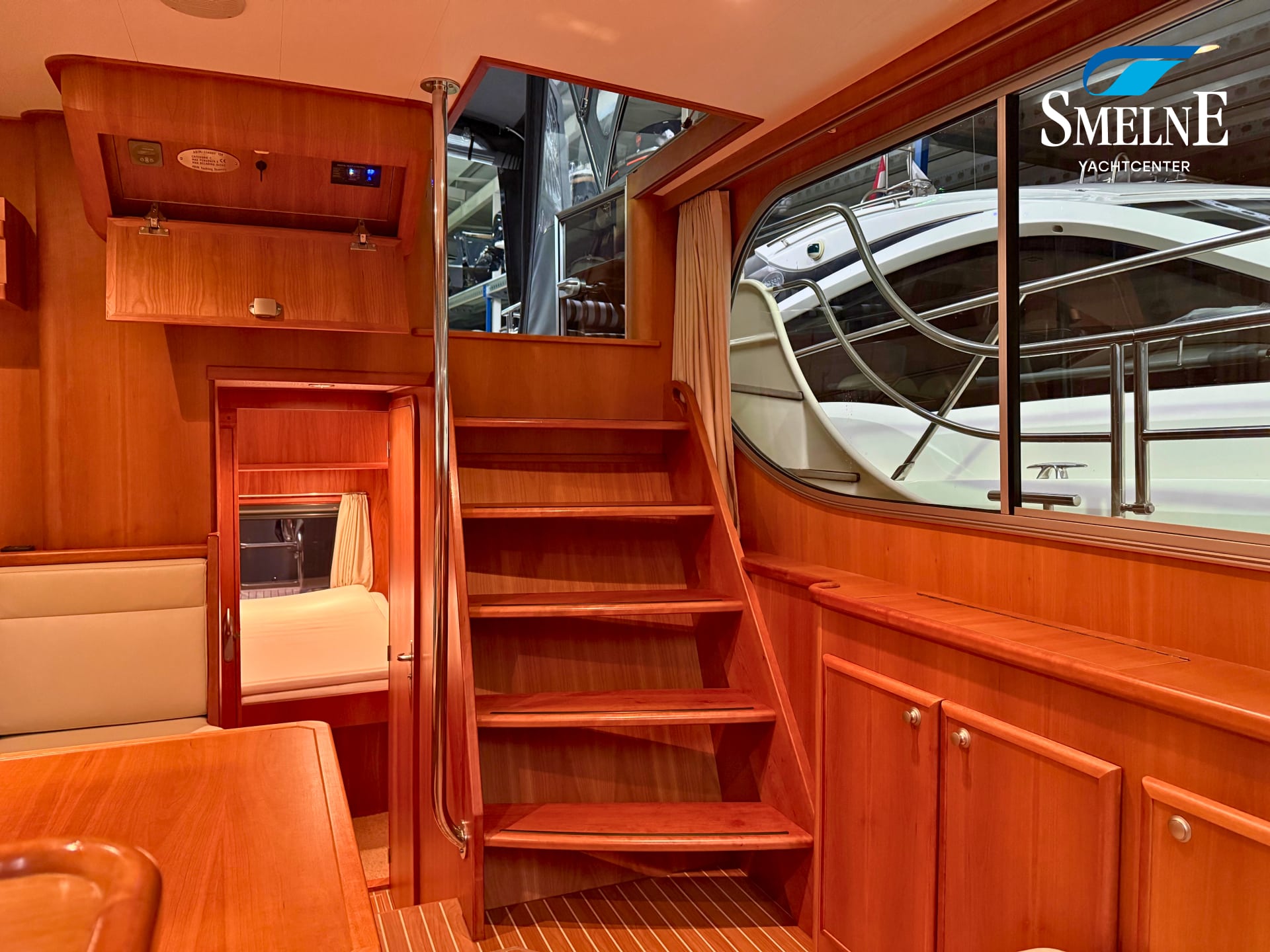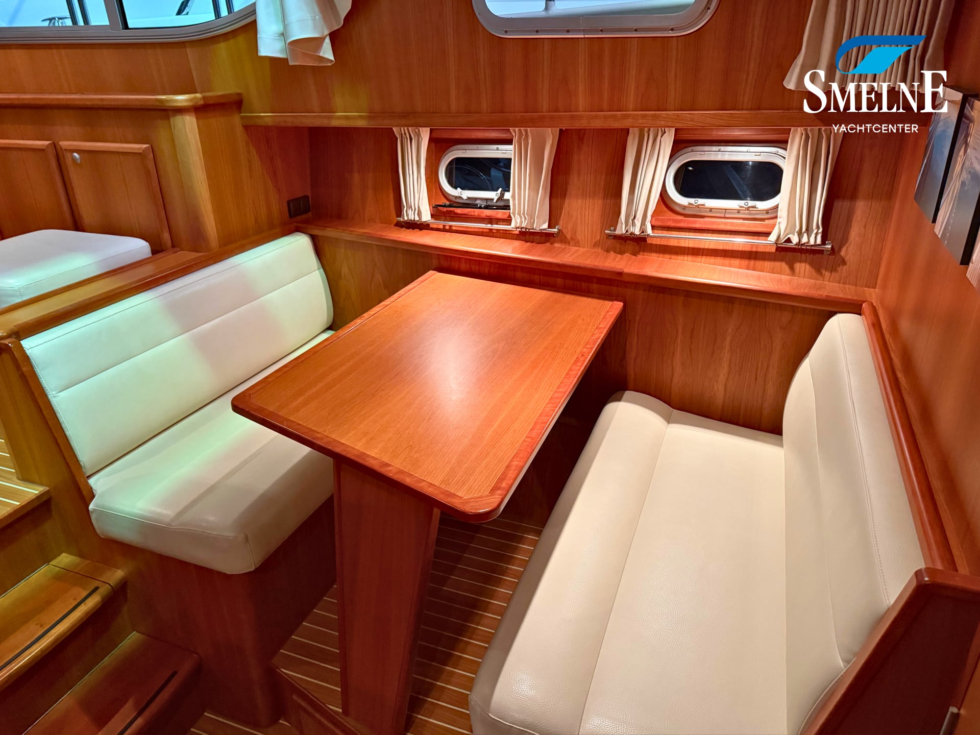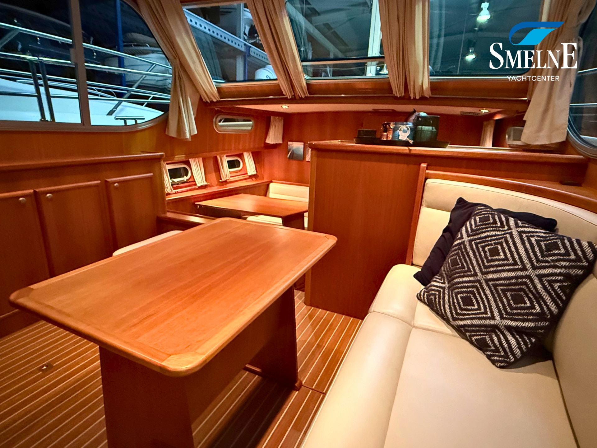 Vanaf het achterdek is de salon direct toegankelijk, waar de L-vormige bank uitnodigt om even te ontspannen en samen te genieten. Het interieur is uitgevoerd in klassiek kersenhout, met teakline vloeren en hoogwaardige lederen bekleding, wat bijdraagt aan de warme en verzorgde uitstraling aan boord. Aansluitend ligt de kombuis met dinette, een plek waar u onderweg rustig kunt ontbijten of ’s avonds uitgebreid dineert, helemaal in alle rust en privacy.