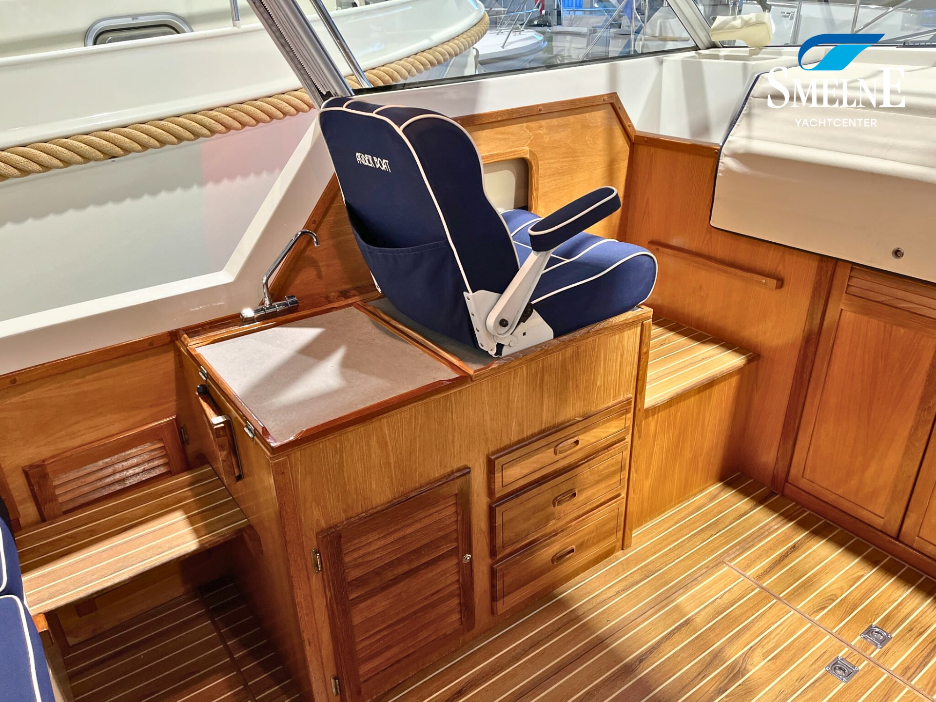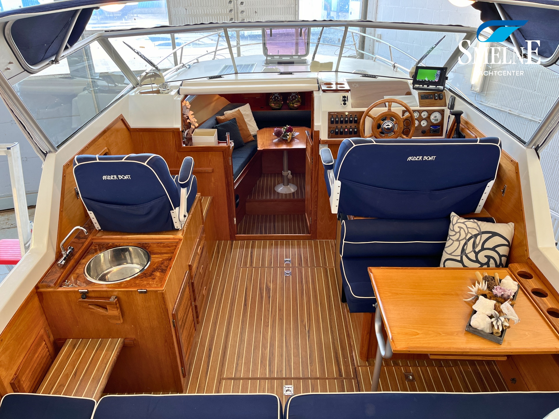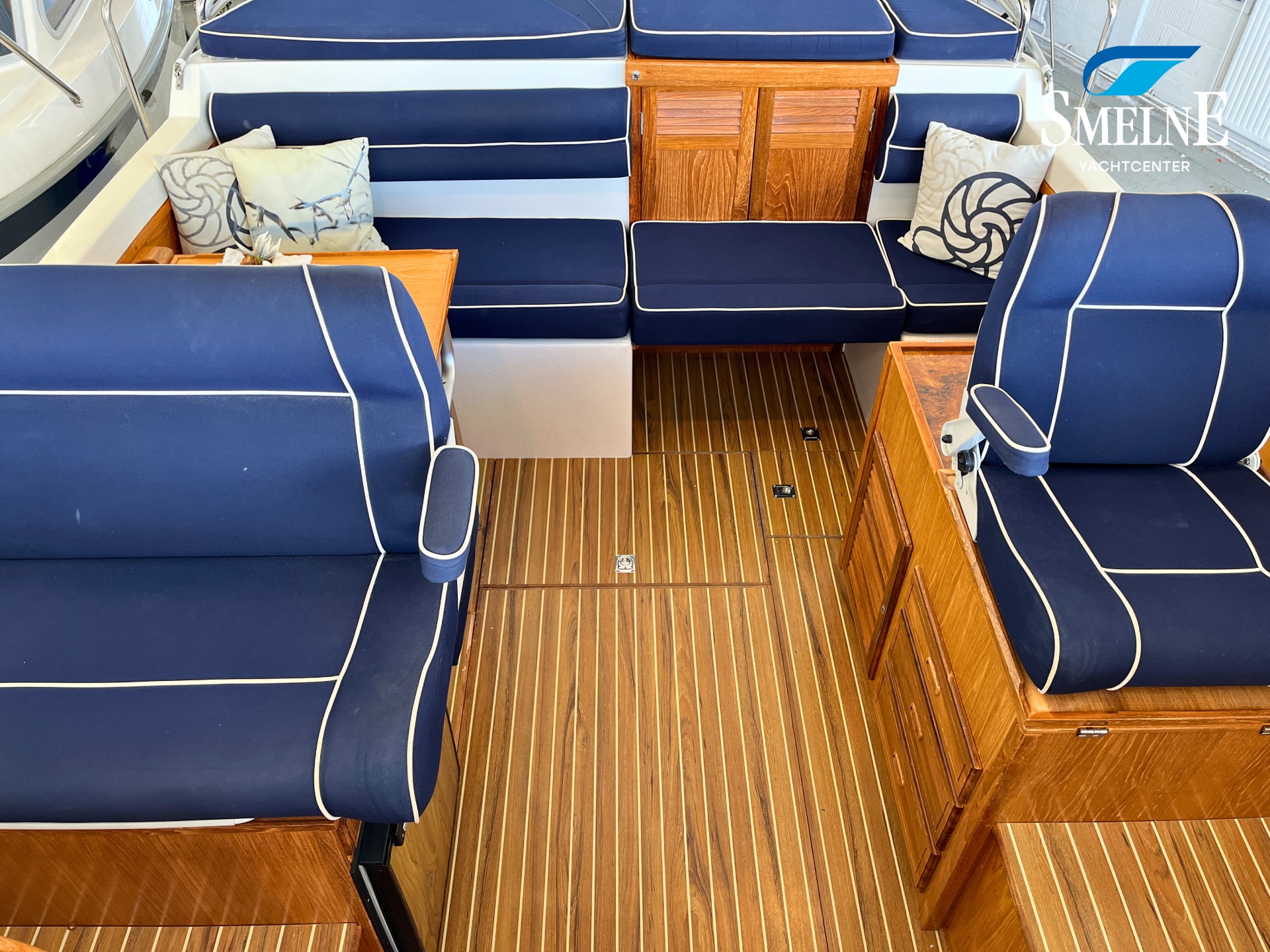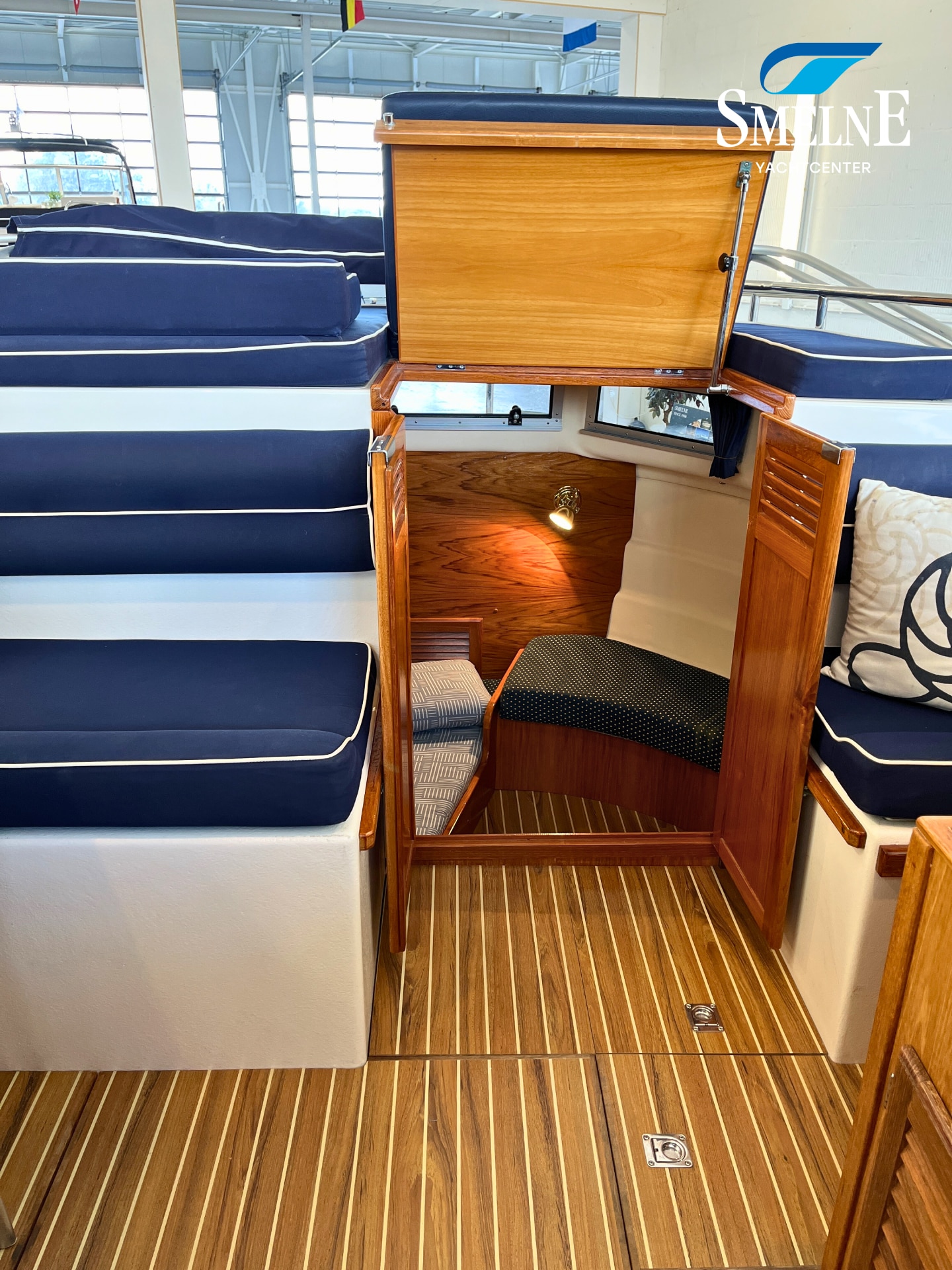 De open kuip is slim ingedeeld met een comfortabele zitgroep, een keuken aan bakboord en een overzichtelijke stuurstand aan stuurboord. De op de keuken geplaatste meevaarstoel kan eenvoudig worden omgeklapt, waardoor het werkblad volledig vrij is. Op het dak van de achterkajuit ligt een royaal zonnebed voor ontspannen momenten aan dek.