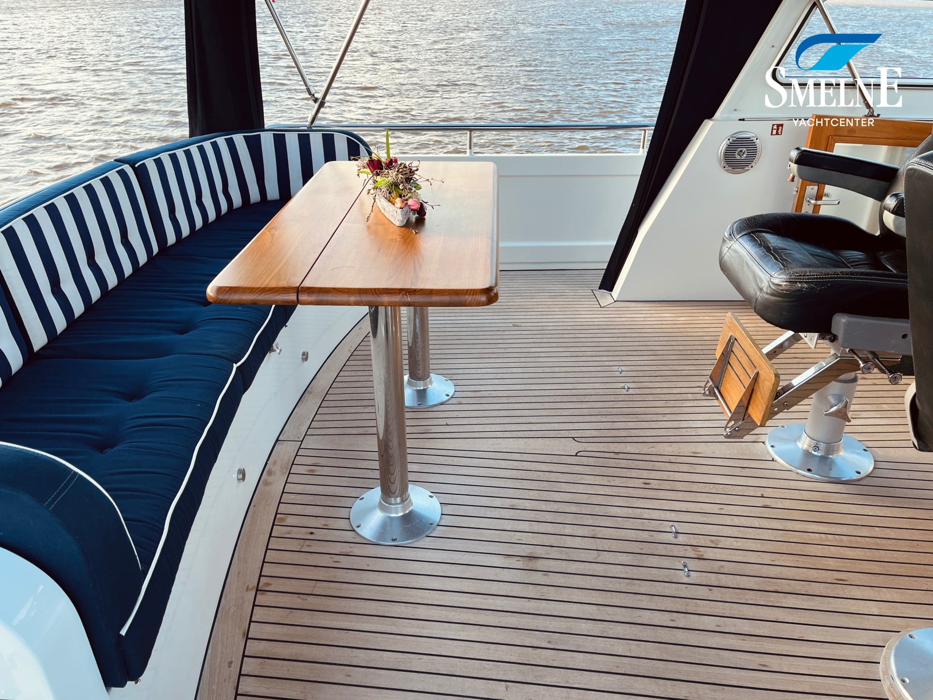 Brede gangboorden met een degelijke RVS railing en handrailingen zorgen voor veilige doorgang rondom. Vanuit de gangboorden of vanaf het zwemplateau bereikt u, via de geïntegreerde draaitrappen, het achterdek. Het ruime achterdek is ingericht met een vaste dekbank, een midscheepse stuurstand met dubbele stuurstoel en een zeer compleet navigatie-instrumentarium. Alles onder een XL-cabriokap voor optimaal comfort, ongeacht het weer.