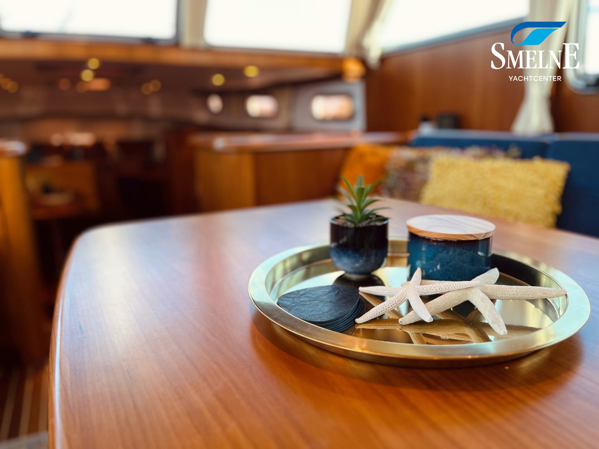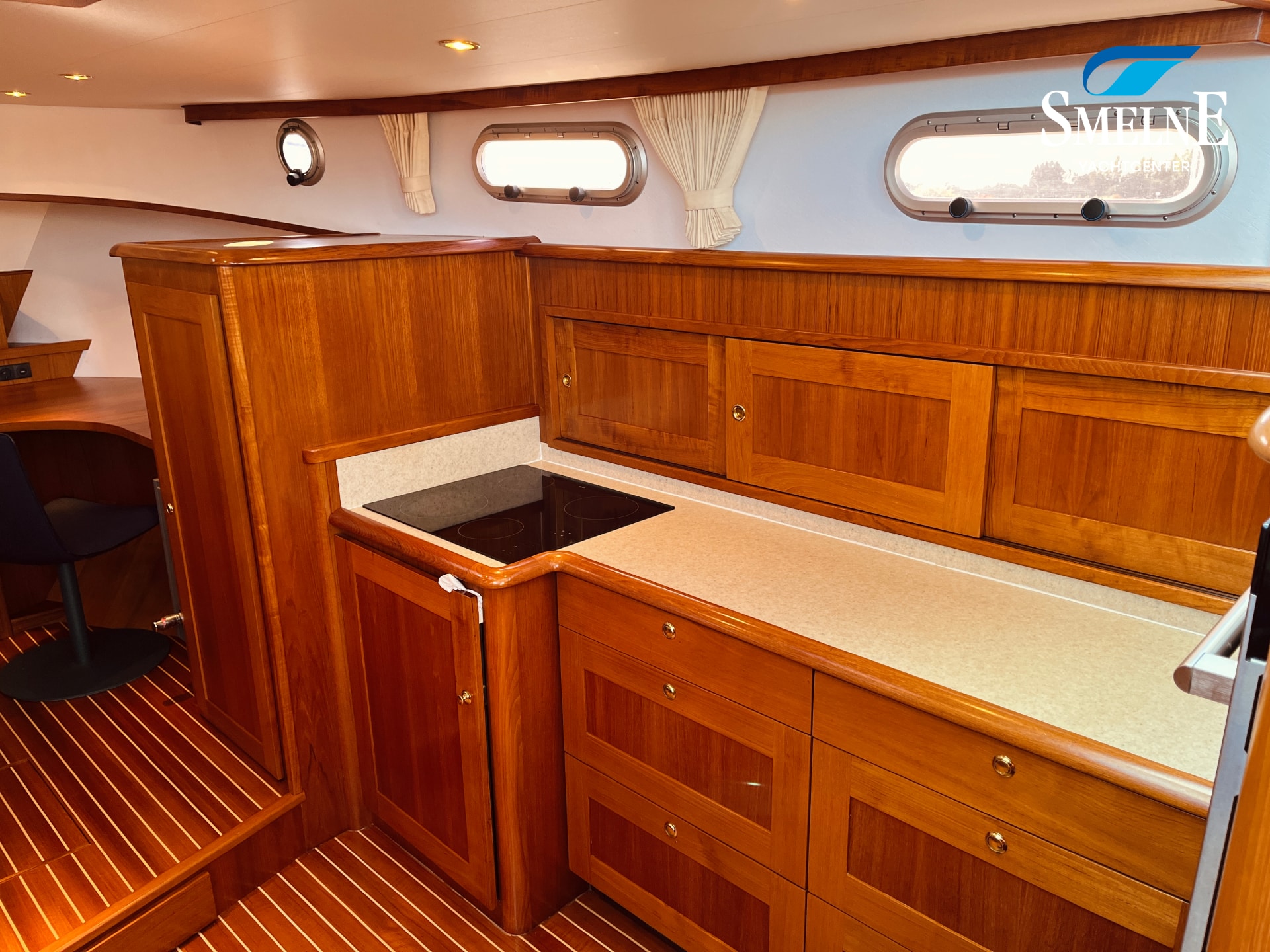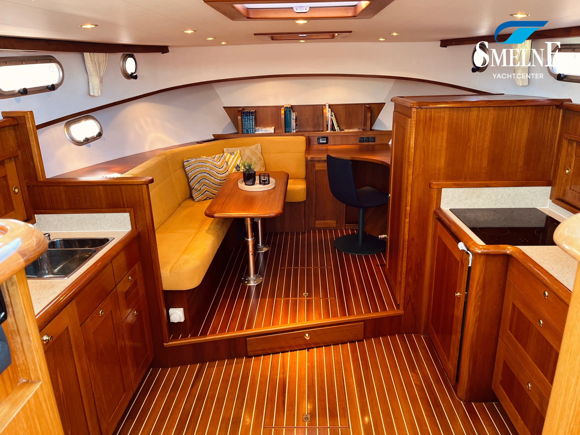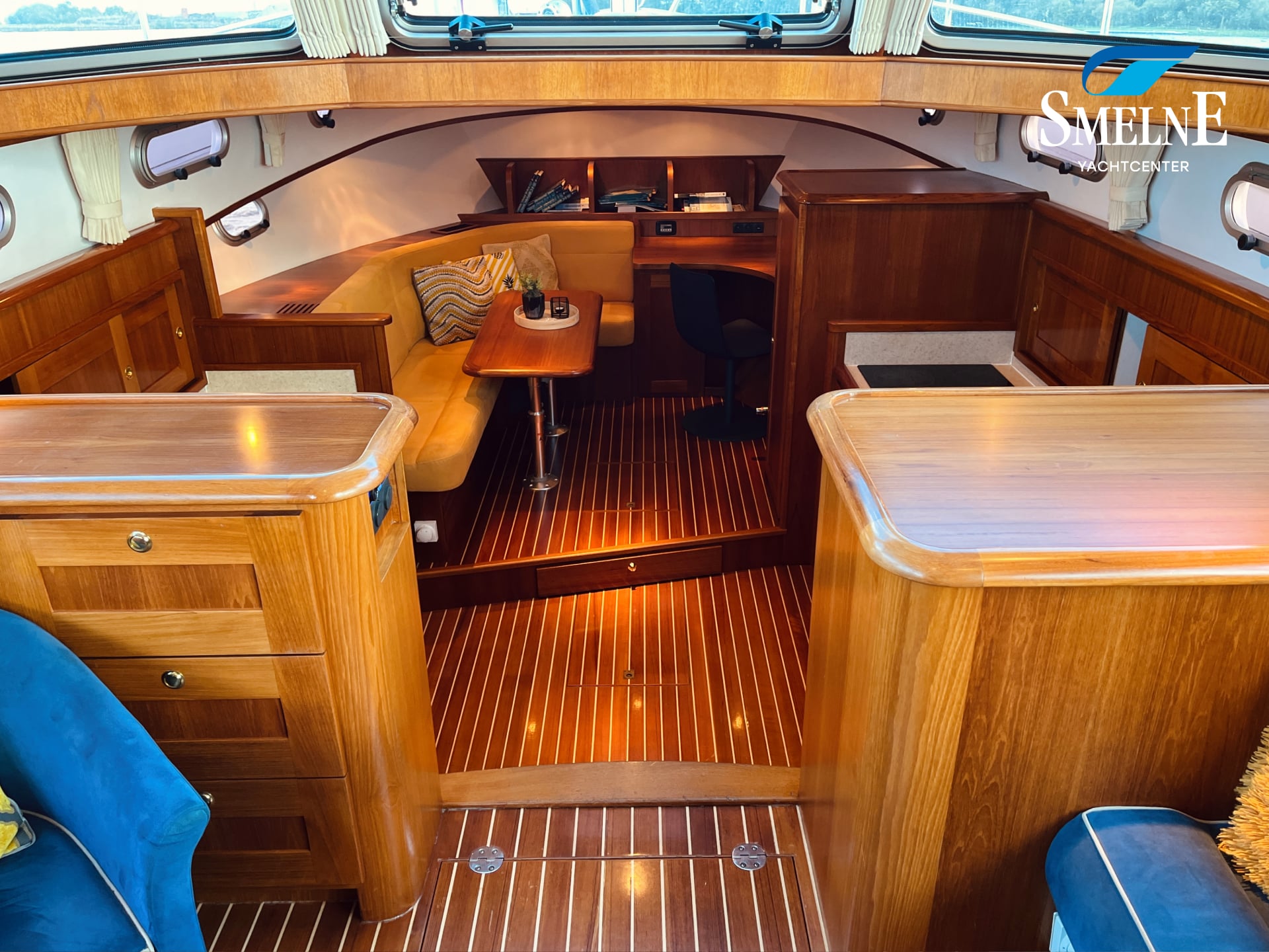 Het interieur is ruimtelijk, warm en volledig uitgevoerd in scheeps teak met veel massief lijstwerk. In de salon vindt u een royale L-vormige bank en een stijlvolle kastenwand met geïntegreerde TV op lift. De kombuis bevindt zich in het voorschip en staat in open verbinding met de salon, wat zorgt voor een aangename ruimtelijke beleving. De keuken is volledig uitgerust en van alle denkbare apparatuur voorzien, en biedt samen met de L-vormige dinette en bureauhoek een uitnodigende leefruimte aan boord.