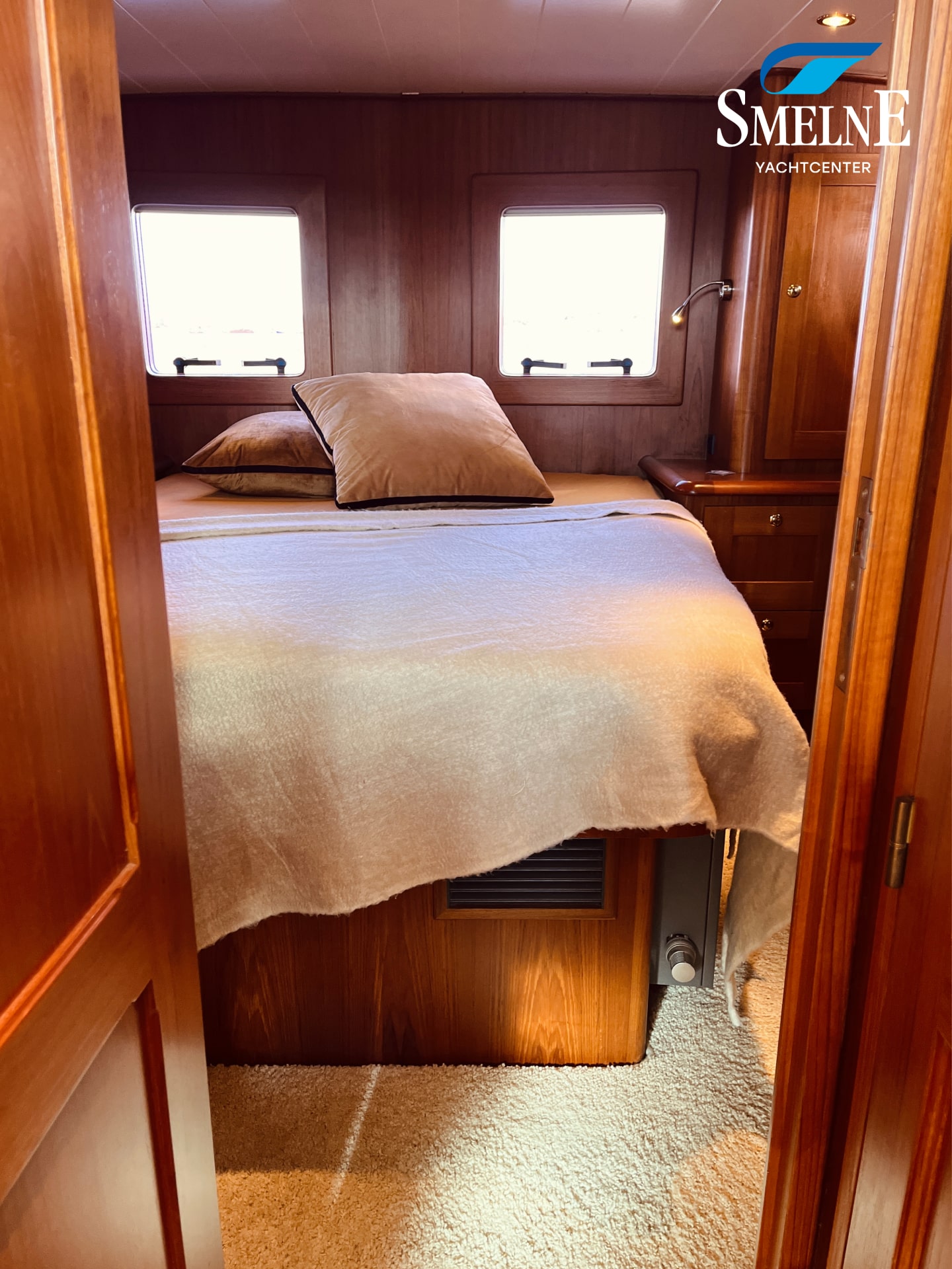 In het achterschip bevindt zich de eigenaarshut, met een vrijstaand ruim dubbelbed, veel kastruimte en directe toegang tot de ensuite doucheruimte. De separate sanitaire ruimte met elektrisch toilet en wasgelegenheid is centraal vanaf de gang bereikbaar.